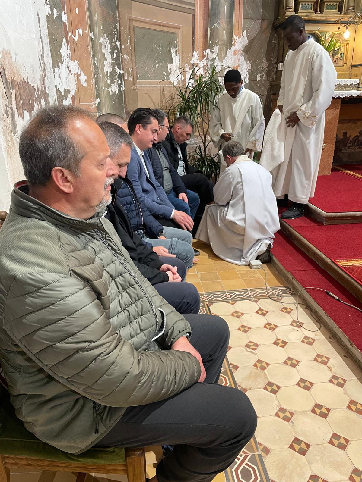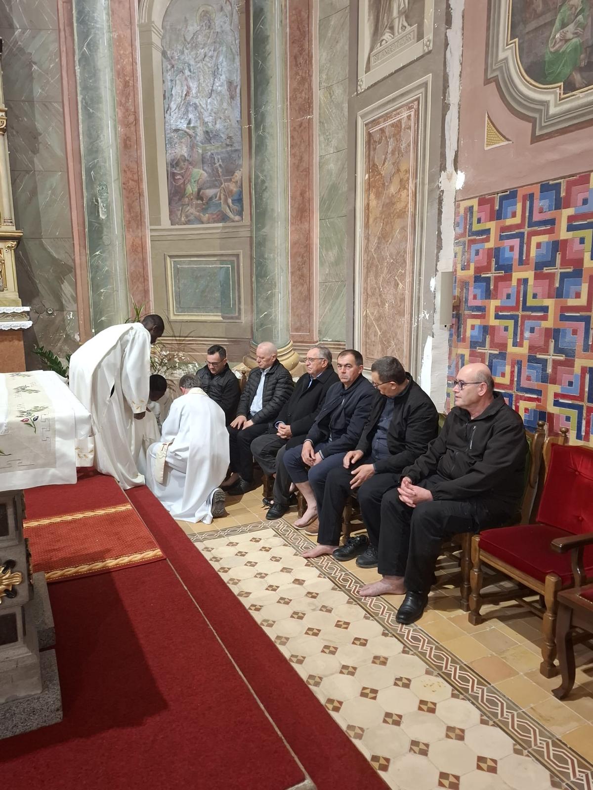 Nakon nadahnute homilije uslijedio je obred pranja nogu. U stavu poniznosti i poštovanja župnik je po uzoru na Isusa, koji je apostolima oprao noge, oprao noge dvanaestorici župljana. Bili su to muževi i očevi koji svojim životom nastoje svjedočiti vjeru te se nesebično daju za obitelj i ugrađuju u život župne zajednice. Zbor je svečanim pjevanjem pratio obred s osobitim poticajnim pripjevom: „Neka u vama ostanu vjera, ufanje i ljubav, to troje: ali najveća je među njima ljubav.“