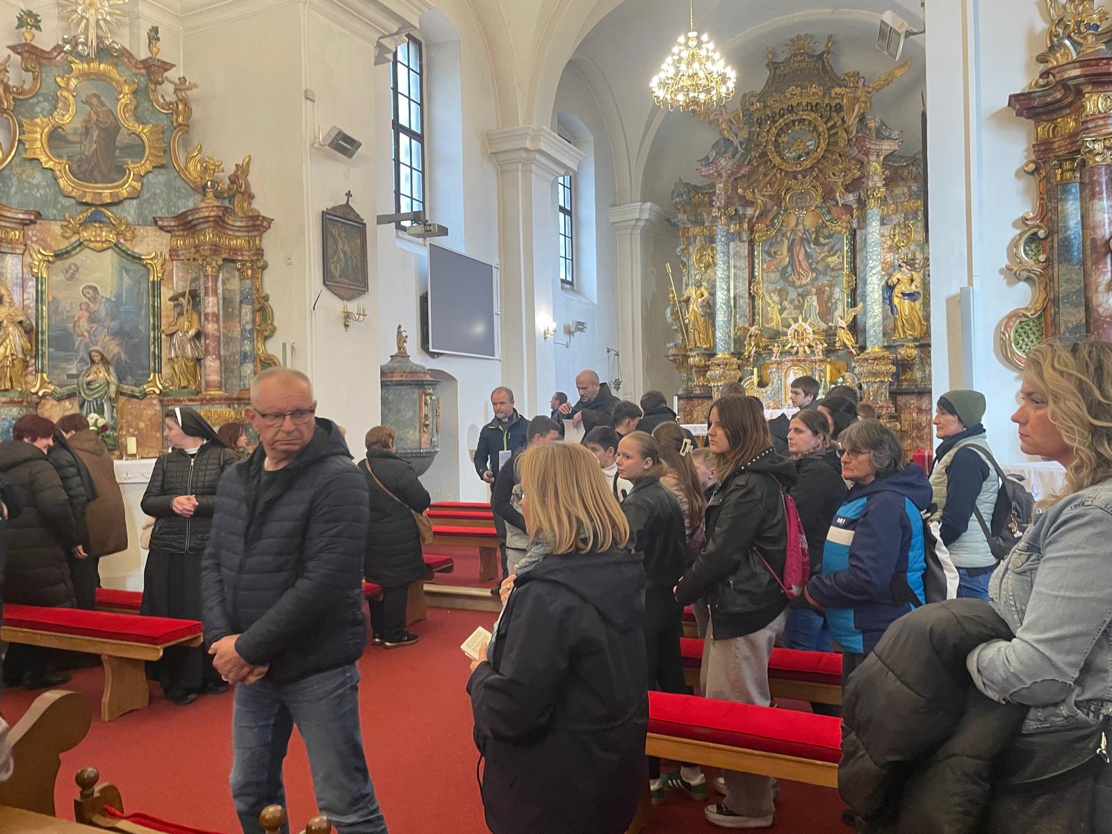 Kod Hotela Sport su vjernici imali kratku pauzu za odmor i okrjepu. Vrijedne ruke su pripremile hranu i piće za sve hodočasnike. Nakon tog predaha hodočasnici su nastavili prema Župi i crkvi svetog Petra apostola. Vrhunac ovoga hoda-križnog puta bila je sveta misa na kojoj su predane molitve, zahvale, brige, križevi vjernika, a koju je nakon 14 te postaje, koja je bila u crkvi slavio župnik vlč. Branko Koretić. Kazao je da će nekoliko trenutaka dok prisutni odmaraju umorne noge iskoristi za kratku homiliju. Vrijeme Korizme pomalo se bliži i kraju i mnogi korizmeni dani su već iza nas. Međutim preostalo je još korizmenog vremena, ne puno ali dovoljno darovanog da se pripremimo za susret s Gospodinom, da se trgnemo iz formalizma i uspavanosti u vjeri, vjerskim obredima i običajima te prionemo srcem uz Gospodina. Korizma traži od svakog ponaosob iskreno i dubinsko obraćenje srca, duše i tijela Isusu Kristu. Poziva nas da dok razmatramo Kristovu muku, žrtvu i smrt na križu budemo svjesni tog otajstva u svakom slavlju euharistije. Upravo sveta misa kao vrhunac kršćanskog i vjerničkog života jest nekrvna žrtva u kojoj se trajno uprisutnjuje i sakramentalno predočuje Kristova žrtva, koja se nije samo dogodila u prošlosti nego svojom spasenjskim djelovanjem i moću zahvaća i nas danas. Pozvani smo otvoriti se i živjeti darovanost i milosti tih otajstava u svakodnevici života, kazao je župnik. Na kraju misnog slavlja prisutnima je uputio poziv da se pridruže i sudjeluju na budućim župnim događanjima, napose: u nedjelju, 22. ožujka 2026., kada će navečer biti scenski prikaz Pasije-Što je istina?, u izvedbi članova Marijine Legije iz Petrinje te 30. ožujka 2026. na Koncertu i scenskom prikazu Križnog puta –Odjeci pasije u klavirskim djelima – u izvedbi studenata Katoličkoga bogoslovnog fakulteta u Zagrebu. Župnik je pozvao i na malu okrepu u župnu dvoranu sv. Josipa, a poziv su svi rado prihvatili.