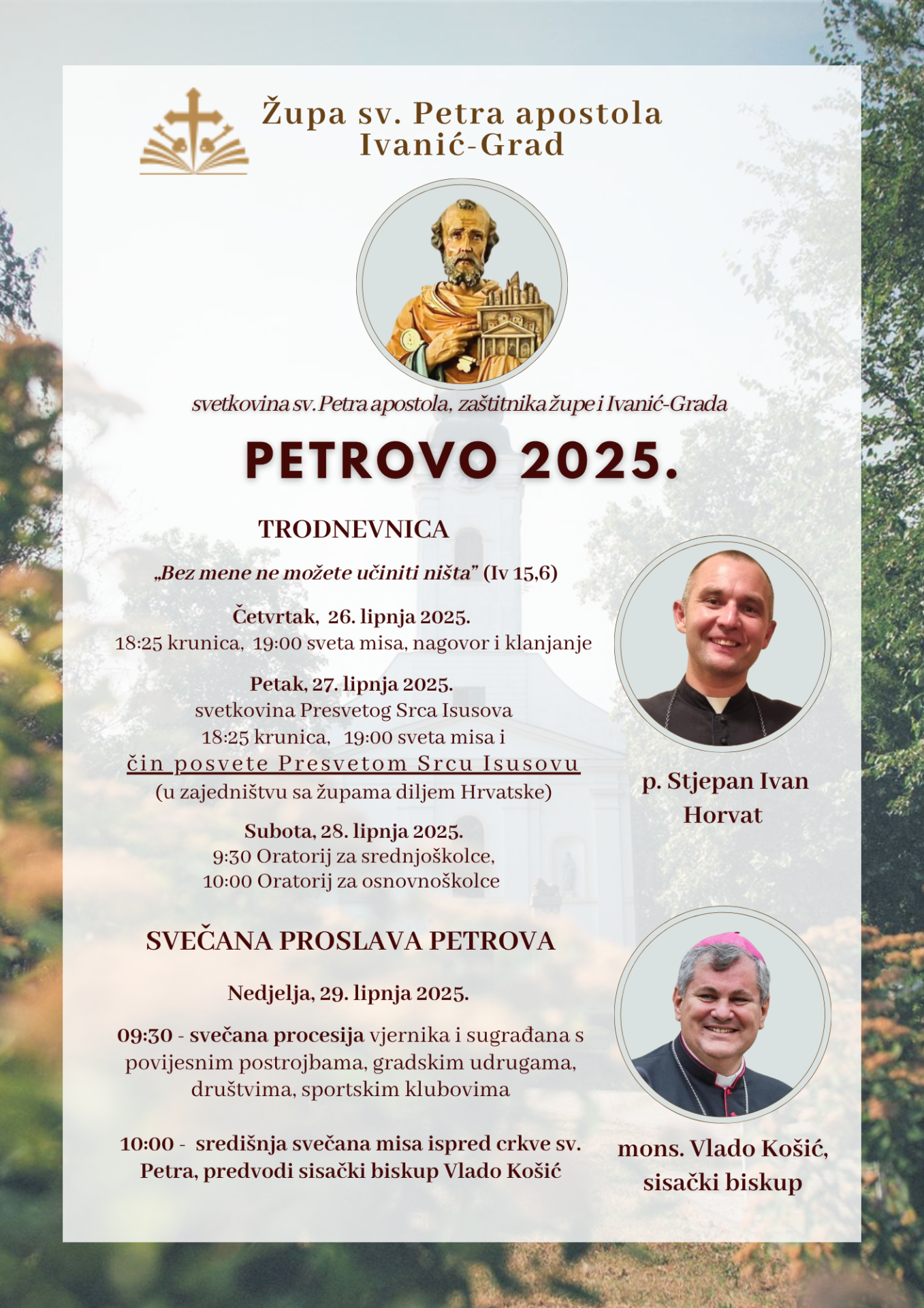 Dragi vjernici, župljani, sugrađani, gosti i hodočasnici, pozivamo vas da se pridružite proslavi svetkovine sv. Petra apostola, zaštitnika naše župe i grada Ivanić-Grada.